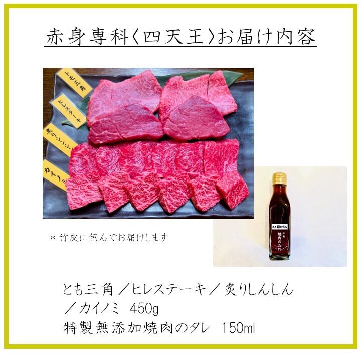【テイクアウト】 焼肉 赤身 黒毛和牛 四天王 (特製無添加焼肉のタレ付) 全額返金保証付 カルビ ロース とも三角 赤身 希少部位